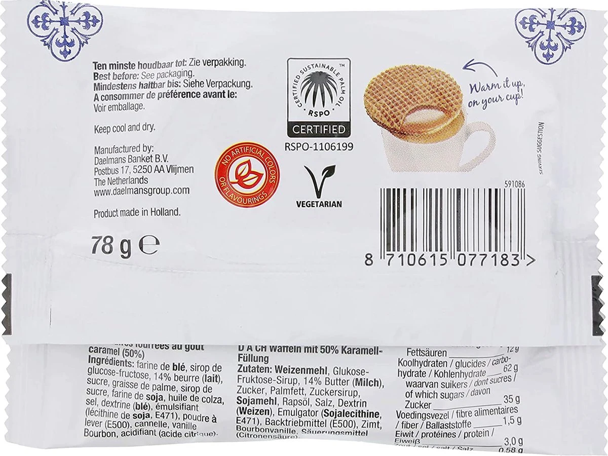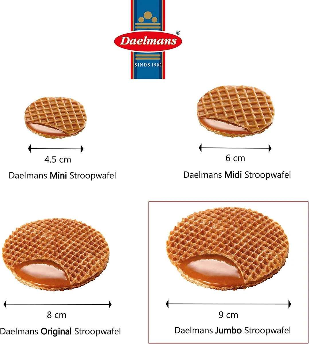 De allerlekkerste Stroopwafels zijn van Daelmans en dat proef je. Onze Jumbo Stroopwafels hebben een diameter van 9 cm, zijn gevuld met een zachte roomboter stroopvulling verrijkt met natuurlijk Bourbon vanille. De Jumbo Stroopwafels zijn ook beschikbaar als 36 x 1 display doos. Hierin zitten 36 Stroopwafels welke allemaal individueel verpakt zijn.