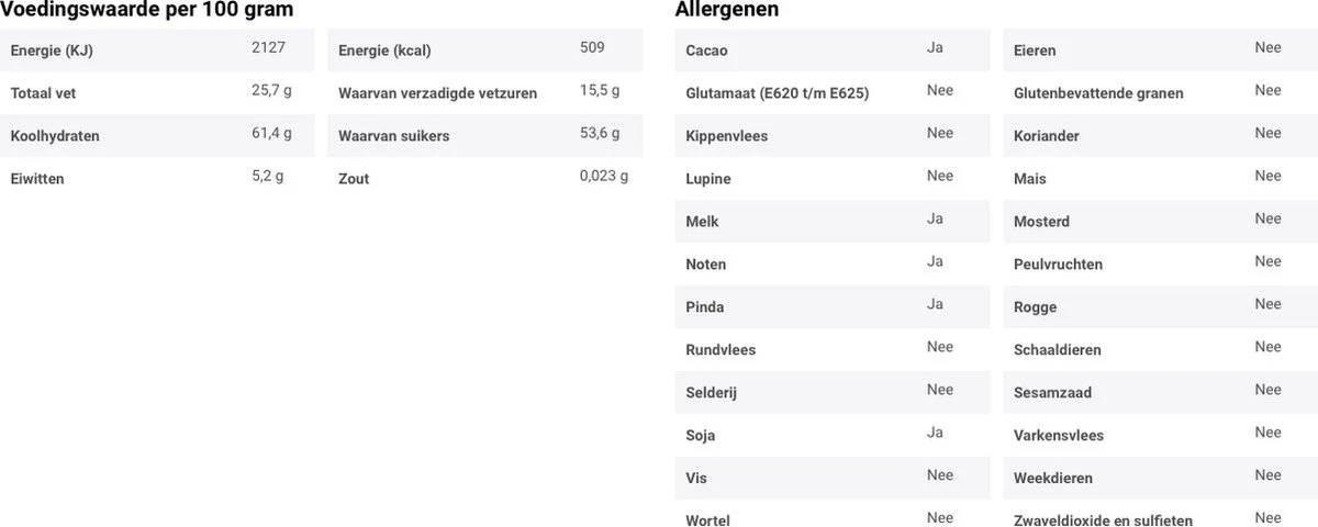 | Ingrediënten | <p>Chocosmaak (suiker, cacao poeder, gehydrogeneerde palmpitolie, volle MELKpoeder, SOJAlecithine, maltodextrine, chocoladearoma, melkaroma), Suiker, Glansmiddel (E414), Kleurstof (E171), Kleurstof (E150d), Kleurstof (E160c), Glansmiddel (E903), Kleurstof (E140), Kleurstof (E163), Kleurstof (E120), Voedingszuur (E330), Kleurstof (E100)</p><p>Kan sporen bevatten van: Glutenbevattende granen, Noten, Pinda's, Sesamzaad, Soja</p> |