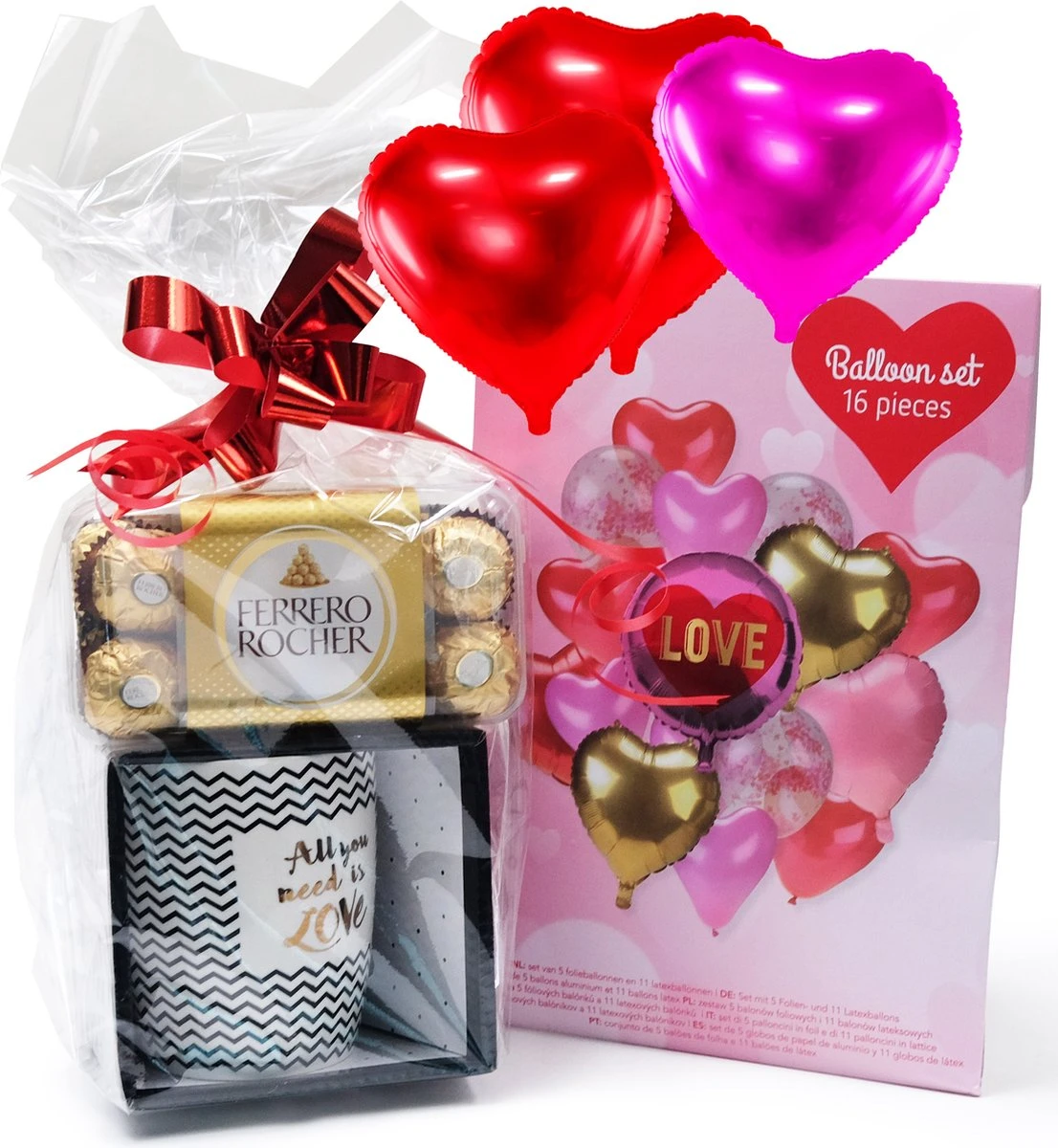 Liefde Cadeaupakket – Valentijn Geschenk – Ferrero Rocher Chocolade – Mok – LOVE Balloon Set 16 Stuks – Relatiegeschenk Giftbox