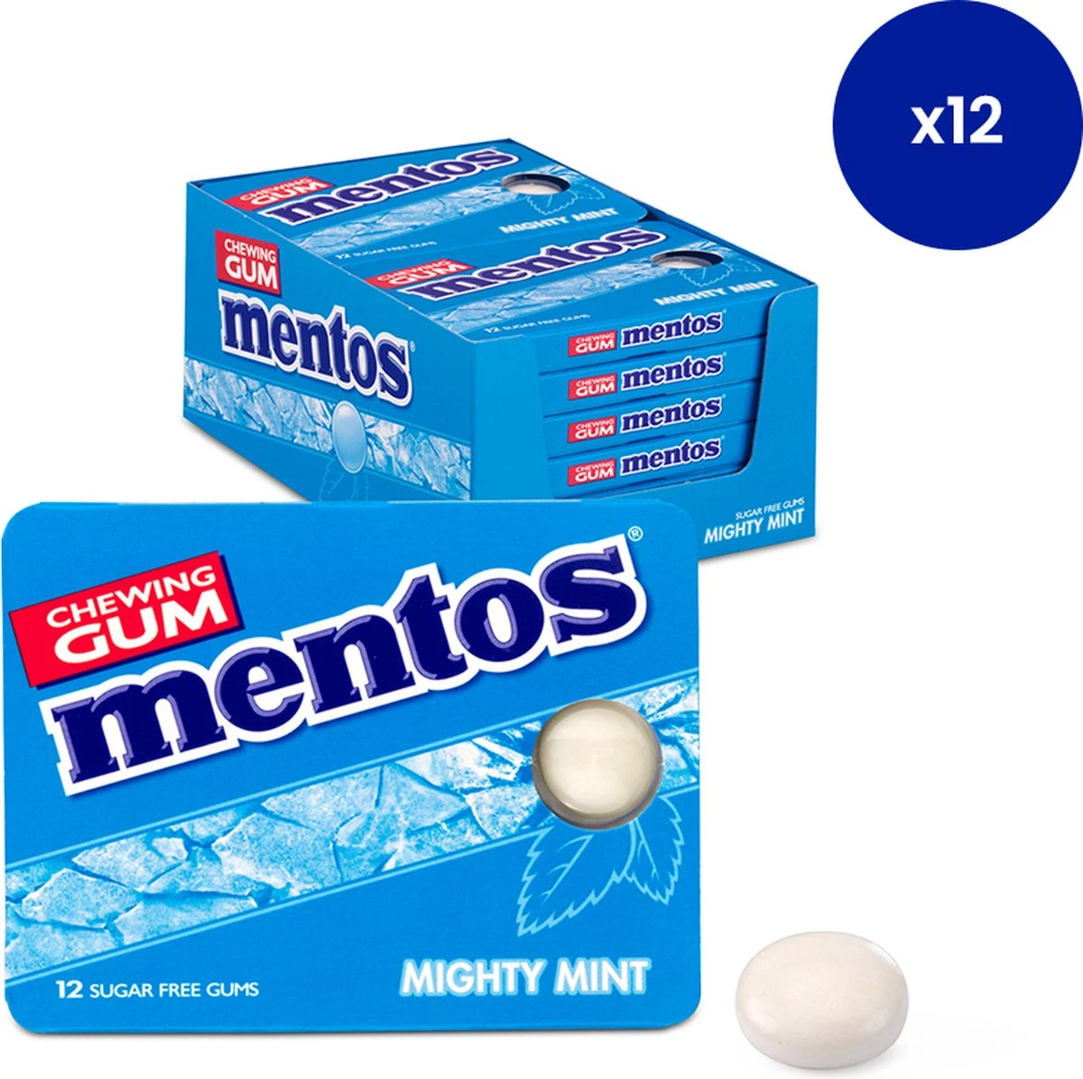 | Verpakkingsinhoud | 12 blisters met elk 12 suikervrije kauwgoms van Mentos in de smaak Mighty Mint. |