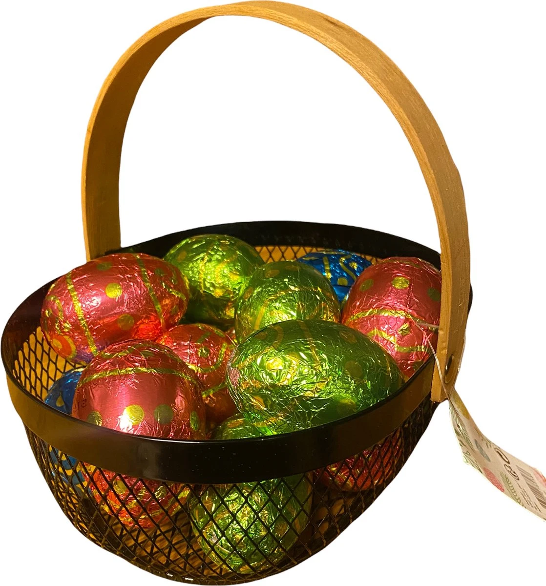Metalen paasmand gevuld met chocolade verstopeieren ter grootte van een echt ei. Verstop deze leuke eieren van melkchocolade en laat de kinderen deze verzamelen in het paasmandje.