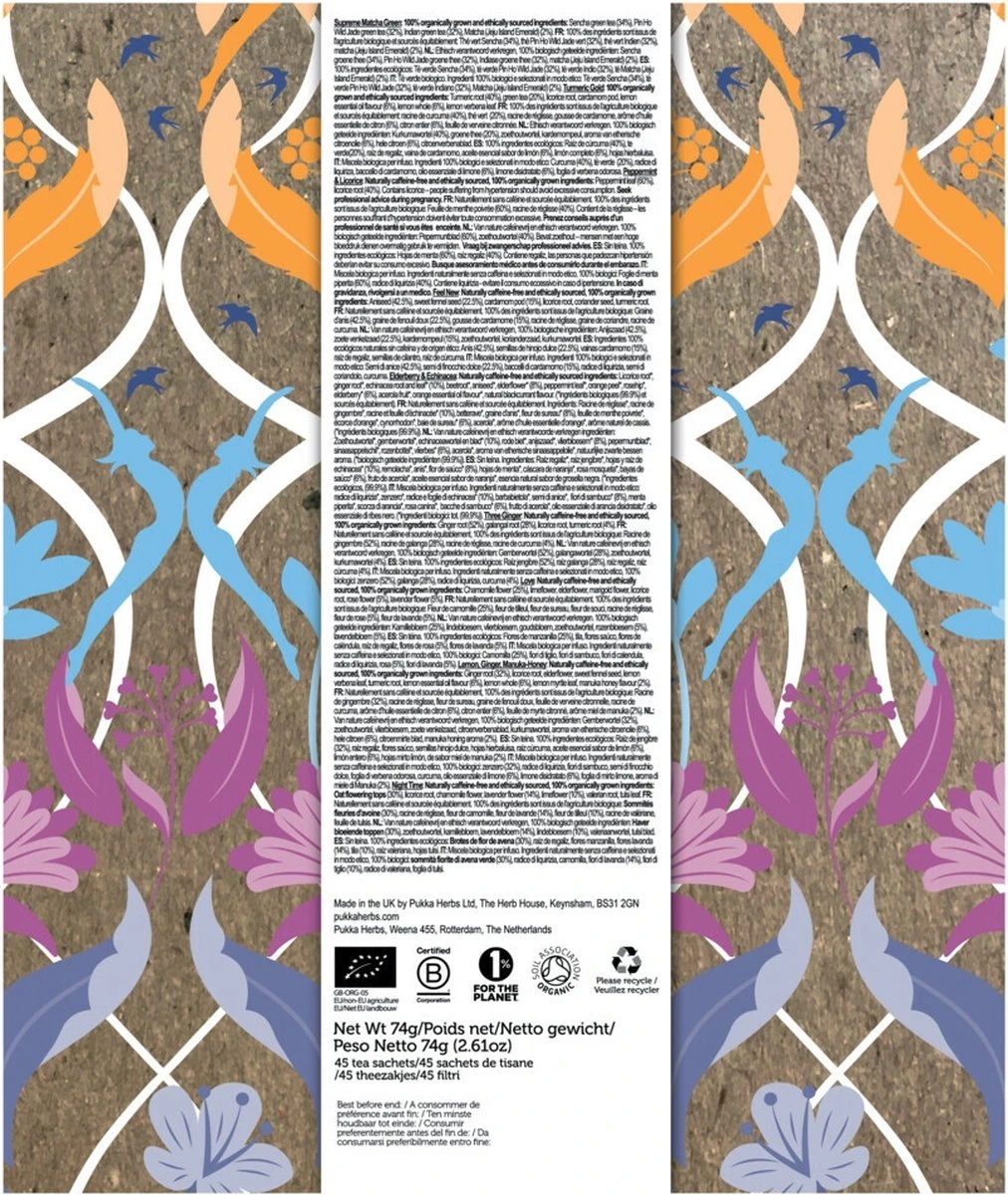 Ontdek de verschillende theesmaken uit de collectie van Pukka. Onze Pukka Thee Selection Box bestaat uit negen verschillende overheerlijke biologische kruidentheeën. De theedoos bevat vijf theezakjes van Supreme Matcha Green, Feel New, Love, Turmeric Gold,, Peppermint & Licorice, Three Ginger, Night Time en Lemon, Ginger & Manuka Honey. Heerlijke blends voor fijne theemomenten! Supreme Matcha Green is een blend met biologische groene thee en het fijnste matcha poeder. Feel New is een blend met anijszaad, venkelzaad, kardemompeulen, zoethout, korianderzaad en kurkumawortel. Love is een blend met kamille, vlierbloesem en lavendel. Turmeric Gold is een blend met biologische kurkuma, groene thee, kardemom en citroen. Elderberry & Echinacea is een blend met echinacea wortel, blad en vlierbloesem. Met Peppermint & Licorice geniet je van de natuurlijke vreugde van organisch zoethout en pepermunt. Three Ginger is een blend met gemberwortel, galangawortel, zoethout en kurkuma. Night Time is een blend met haverbloem, verzachtende lavendel en zijdezachte limoenbloem. Lemon, Ginger & Manuka Honey is een blend met gemberwortel, citroen en manuka honing aroma. Al onze theeën zijn gemaakt van 100% biologische ingrediënten die duurzaam verbouwd zijn. Breng deze heerlijke kruiden tot leven door ze tot 15 minuten in vers gekookt water te laten trekken. De collectie box bevat 45 (9 x 5) individueel verpakte theezakjes die volledig biologisch afbreekbaar zijn. Het is onze missie om mensen te inspireren bewuster te leven en de bijzondere kracht van kruiden te ontdekken. Mensen, planten en de planeet staan centraal in alles wat wij doen. Wij streven ernaar positieve verandering te brengen op de wereld – voor jou, de natuur en alles daar tussenin. Bovendien zijn we trots om aangesloten te zijn bij 1% for the Planet en is dit product Fair for Life en FairWild gecertificeerd.