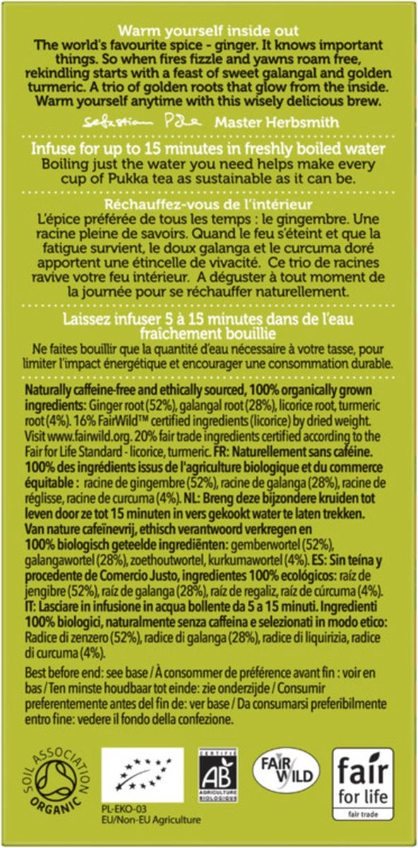 IngrediëntenGemberwortel (51%), galangalwortel (28%), zoethoutwortel, kurkumawortel (4%), gember essentiële olie aroma (1%). 100% gecertificeerd biologisch.