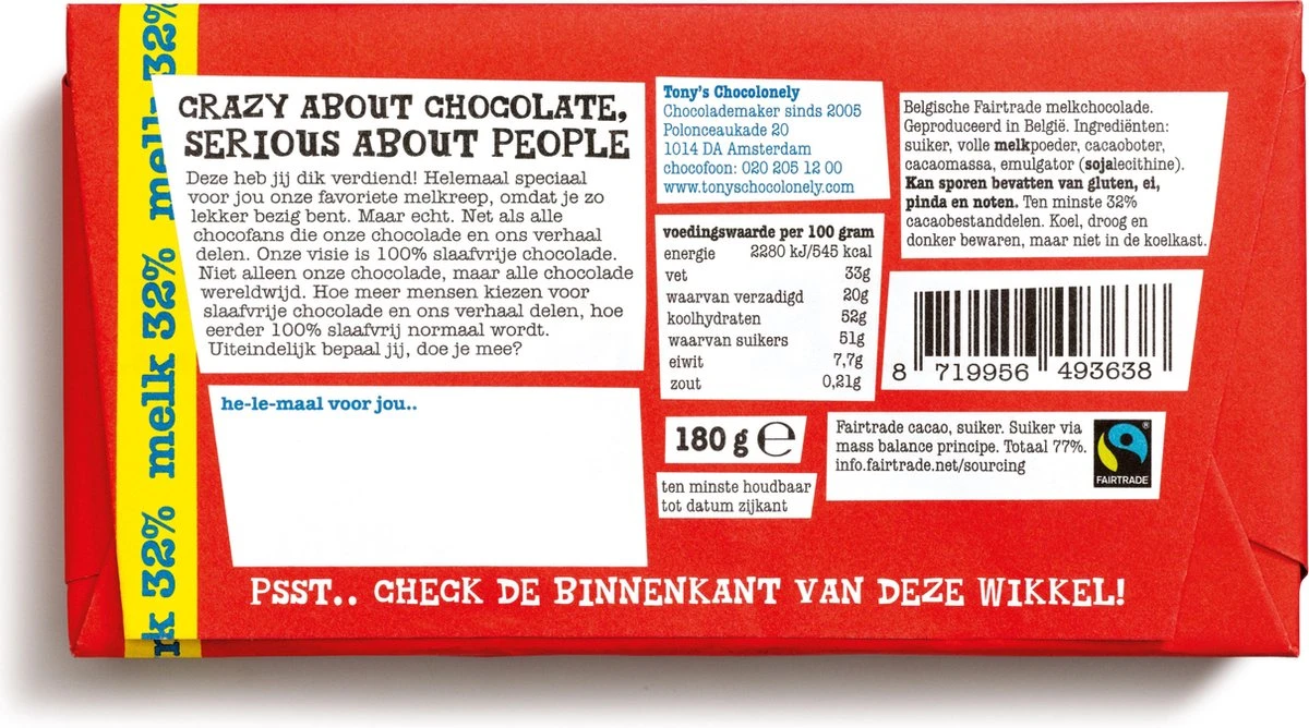 Wat je ook te zeggen hebt, je zegt ’t vanaf nu met een reep. Da’s beter dan een mond vol woorden. Stuur je bestie, je neefje of je collega ’n je wordt bedankt-reep met melkchocolade omdat hij of zij zo lekker bezig is! Maar echt. Voor het zélf maken van je eigen unieke wikkel ga je naar: tonyschocolonely.nl