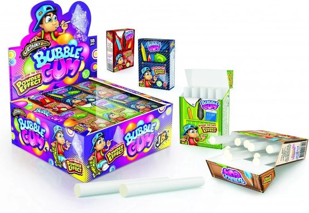 Witte sigaretten kauwgom met poedereffect. Wanneer je blaast in de kauwgom komt er een poeder uit dat een rook effect geeft. In een doos zitten 18 pakketten en ieder pakket zitten 10 sigaretten kauwgom